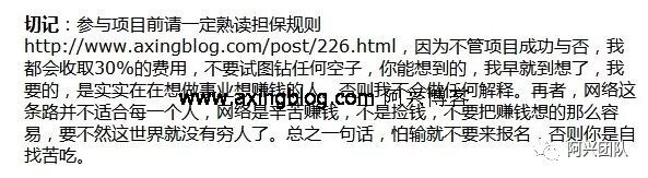 参与项目前请一定熟读担保规则http://www.axing88.com/post/226.html,因为不管项目成功与否,我都会收取30%以上的费用,不要试图钻任何空子,你能想到的,我早就到想了,我要的,是实实在在想做事业想赚钱的人。否则我不会做任何解释。再者,网络这条路并不适合每一个人,网络是辛苦赚钱,不是捡钱,不要把赚钱想的那么容易,要不然这世界就没有穷人了。总之一句话,怕输就不要来报名,否则你是自找苦吃。