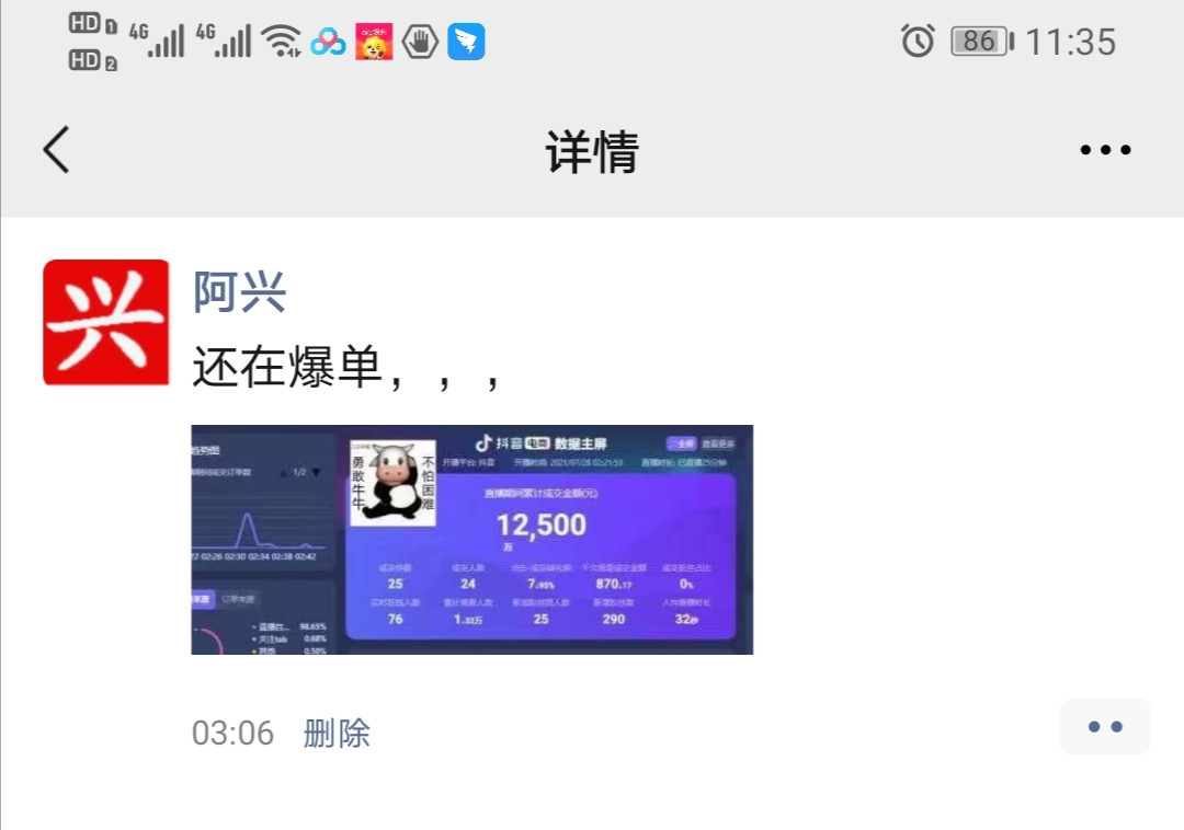这是 7月25日凌晨的直播收益图,两场直播10万销售